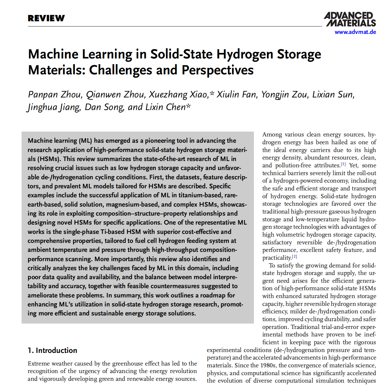 青年教师周盼盼以第一作者身份在材料领域顶级期刊《Advanced Materials》上发表了题为“Machine Learning in Solid-State Hydrogen Storage Materials: Challenges and Perspectives”的综述长文(非邀稿),成人文学