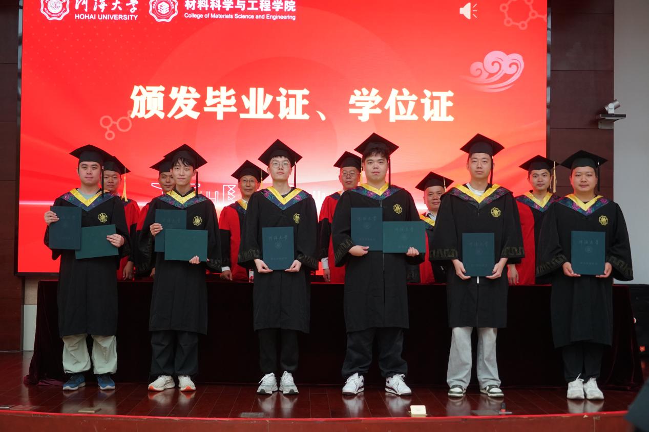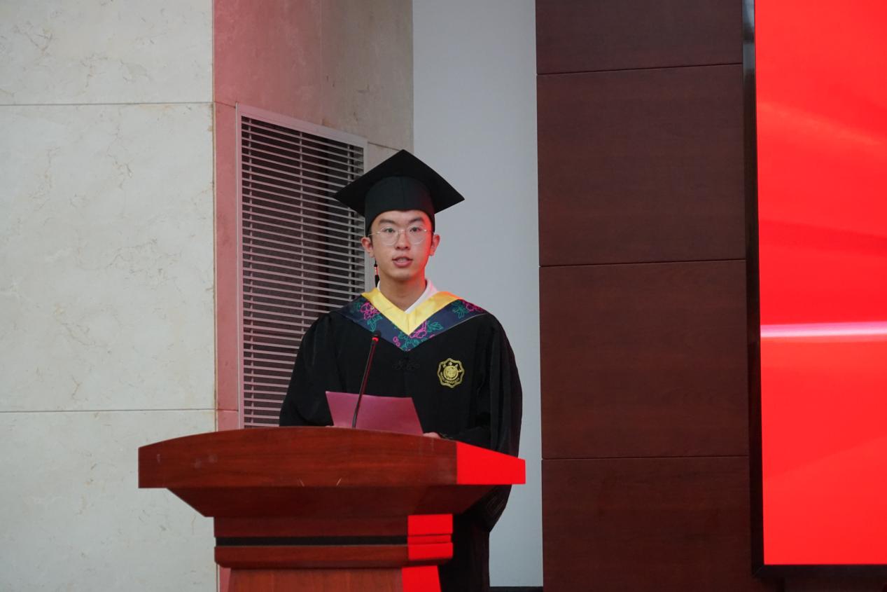 毕业生代表张皓亮同学代表全体2025届本科毕业生发言。他深情回顾了在成人文学 求学的点滴,表达了对学院精心培养、师长悉心教诲、同窗互助友情的深深感激。发言中,他分享了四年来的成长感悟与收获,畅谈了对未来的憧憬与规划,并代表全体毕业生庄严承诺:将铭记“天下有溺犹己溺,此志毋稍驰”的使命担当,传承材料人的优良品格,以扎实的专业知识、过硬的能力素质和强烈的社会责任感,在建设科技强国、制造强国的征程中贡献青春力量,不负母校和学院的期望。