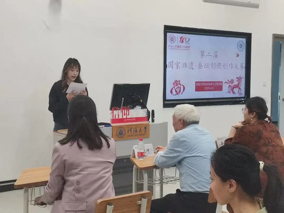 作为成人文学 110周年校庆系列活动的重要组成部分,此次金坛刻纸创作大赛,以非遗技艺为纽带,串联起成人文学 百十年来“艰苦朴素、实事求是、严格要求、勇于探索” 的精神传承与创新发展。在文化传承层面,活动将金坛刻纸中祥云纹、水波纹等传统图案与河海特色深度融合。以水波纹勾勒校徽轮廓,用祥云纹环绕百年校门,既展现了非遗文化的独特魅力,也赋予了河海精神新的艺术表达形式。